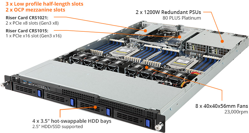 Дублированные блоки питания уровня 80 Plus ‘Titanium’ или ‘Platinum’ обеспечивают высокоэффективное питание для серверов GIGABYTE Xeon Scalable независимо от нагрузки, обеспечивая высокие показатели OPEX.